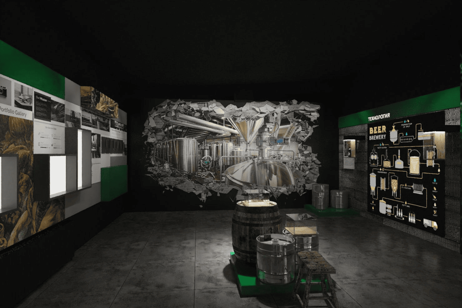 Во втором зале представлена история компании «Бавария». Используя мультимедийные технологии, гости могут проследить весь путь продукта – от зерна до готового напитка – и увидеть, как создаются вкусы, знакомые многим поколениям.